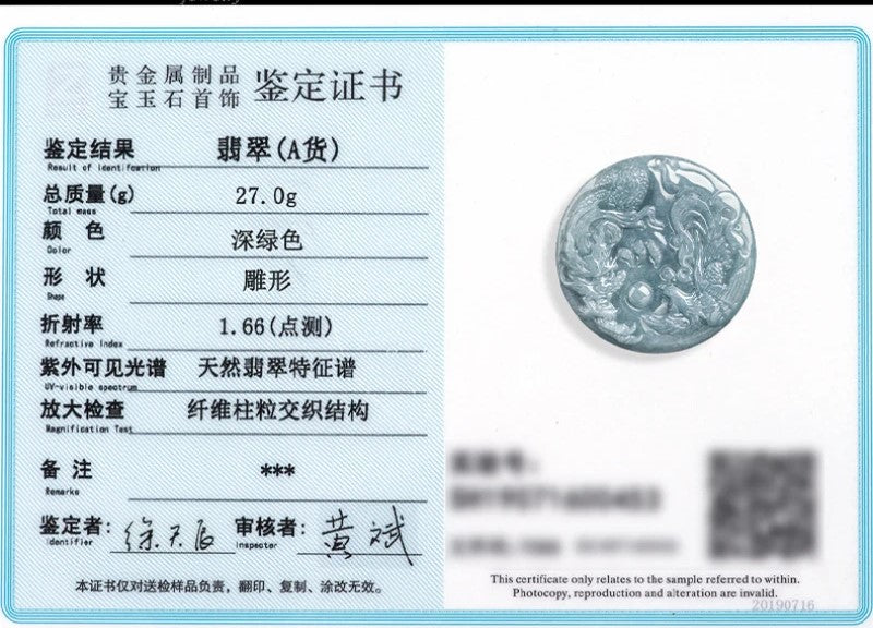 Certification from 3rd party authority to verity as Grade A Natural Jade.